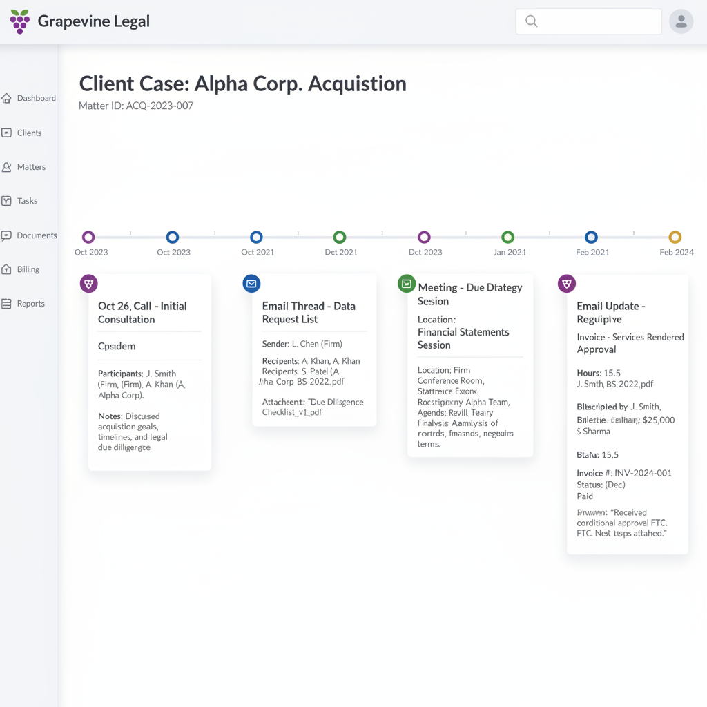 Email from client in Gmail. Case notes in Word. Time entries in Excel. Documents in Dropbox. Client calls recorded nowhere. When the client asks 'What's the status?', you scramble through 5 different places.